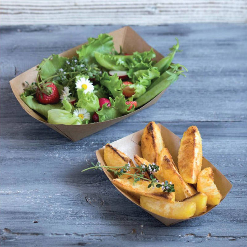 Vsestransko uporabni pladenjčki za serviranje hladne, tople, ocvrte hrane z omakami. Zaščiteni so z dodatnim slojem, ki preprečuje puščanje, zato lahko na njih postrežete hamburgerje, krompirček, hot dog in solate. Izdelani so iz rjavega papirja, ki daje embalaži naraven videz, zato se bodo lepo podali tudi k vašim domačim piknikom.
